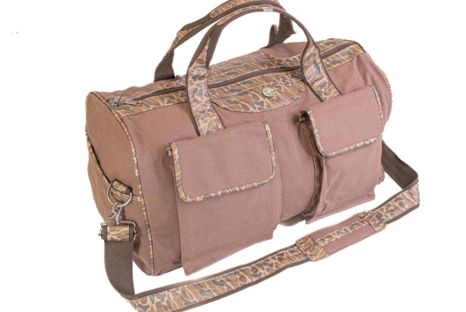 Show your passion with an original Zep-Pro Old School Camo weekender bag featuring a Shot Shell design. The logo and camo print on this duffel bag taps into our intrinsic connection to nature and wildlife. It is a stylish and unique way to show enthusiasm while keeping clothes and toiletries secure and organized. This Zep-Pro weekender is constructed of heavy waxed canvas and sturdy pebble grain camo accent trim. There are 2 front and side pockets for quick access. An accented antique copper Shot Shell concho proudly displayed on the front.