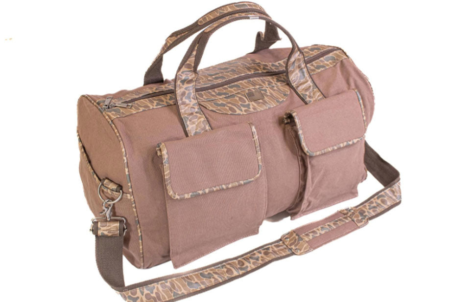 Show your American pride with an original Zep-Pro Old School Camo weekender bag featuring a USA Flag design. The American Flag logo and camo print on this duffel bag taps into our intrinsic connection to one's country. It is a stylish and unique way to show enthusiasm while keeping clothes and toiletries secure and organized. This Zep-Pro weekender is constructed of heavy waxed canvas and sturdy pebble grain camo accent trim. There are 2 front and side pockets for quick access. An accented antique copper USA Flag concho proudly displayed on the front.